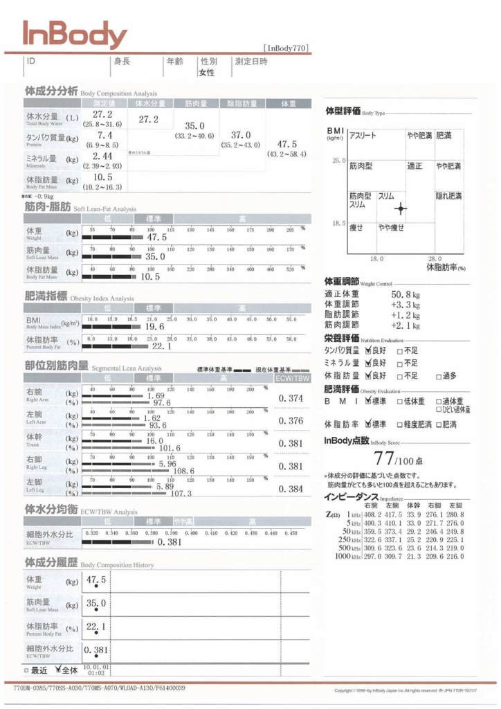 しかし、筋トレや適切な栄養摂取、生活習慣の見直しによって改善することが可能です。定期的にインボディ測定を行い、自分の筋肉量を「見える化」することで、サルコペニアやフレイル予防につながり、健康寿命を延ばす一歩になります。日々の生活の中で、少しずつ筋肉を意識して取り組むことが大切です。