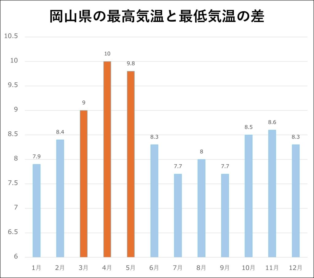 気象庁公開の気温推移(1ヶ月を通じての最高気温と最低気温の差)によると、1年の中でも3月~4月が最も寒暖差の激しい月です。1日の中での気温差の平均(月間)も、やはり3月~5月が最大レベルです。